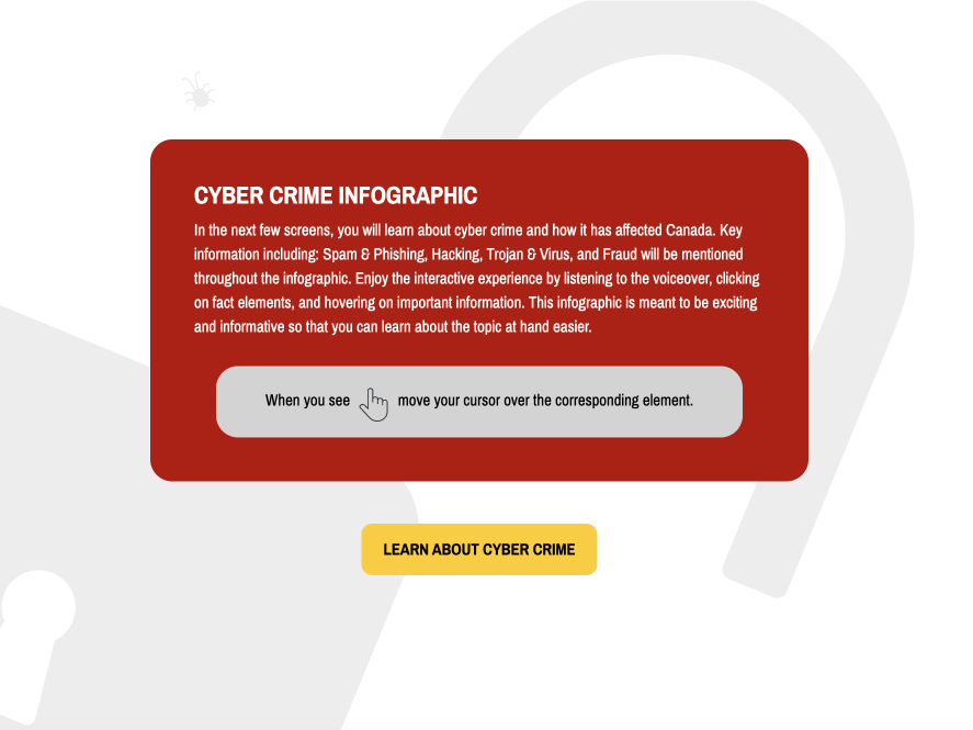 Most of the infographic relied on great elements to support the information. After a few consults and tweaking the design elements, it was time to start implementing the design into a framework. There were certain features that were absolutely needed for the infographic to be successful. A description and instruction section on the first screen was added to help with the user experience, following is a button to start the infographic experience. After adding in the design elements and illustrations, I added smooth transitions and easy navigation. The audio clips were added and I followed the voiceover to create a build with the screen elements. The elements were animated in ways that enhance the user experience throughout. These features include: looping animations, user interactivity, and hover features. Everything done for this project such as the design, coding, and audio were very big parts in making it a success.My task was to create the design of the project including all of the elements. Designs and elements were made for all six screens including the intro and the reference screen. The preloader, begin button, screens, elements, navigation, and transitions was to be completed as part two of the project. As part three of the project, interface animation, screen content build, screen interactivity, looping animations, and audio was to be completed. This completed version of the Cyber Crime infographic was made within a limited timeframe and exemplifies a successful, exciting, informative interactive motion graphic.