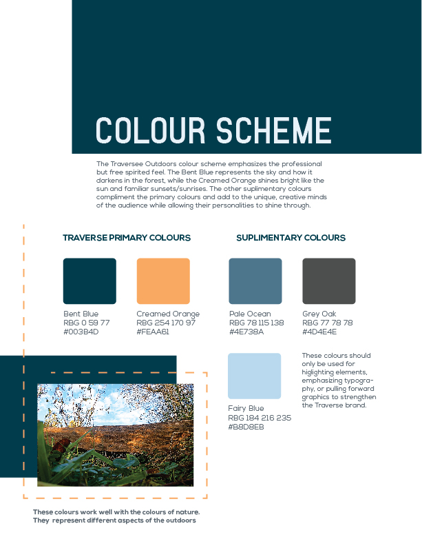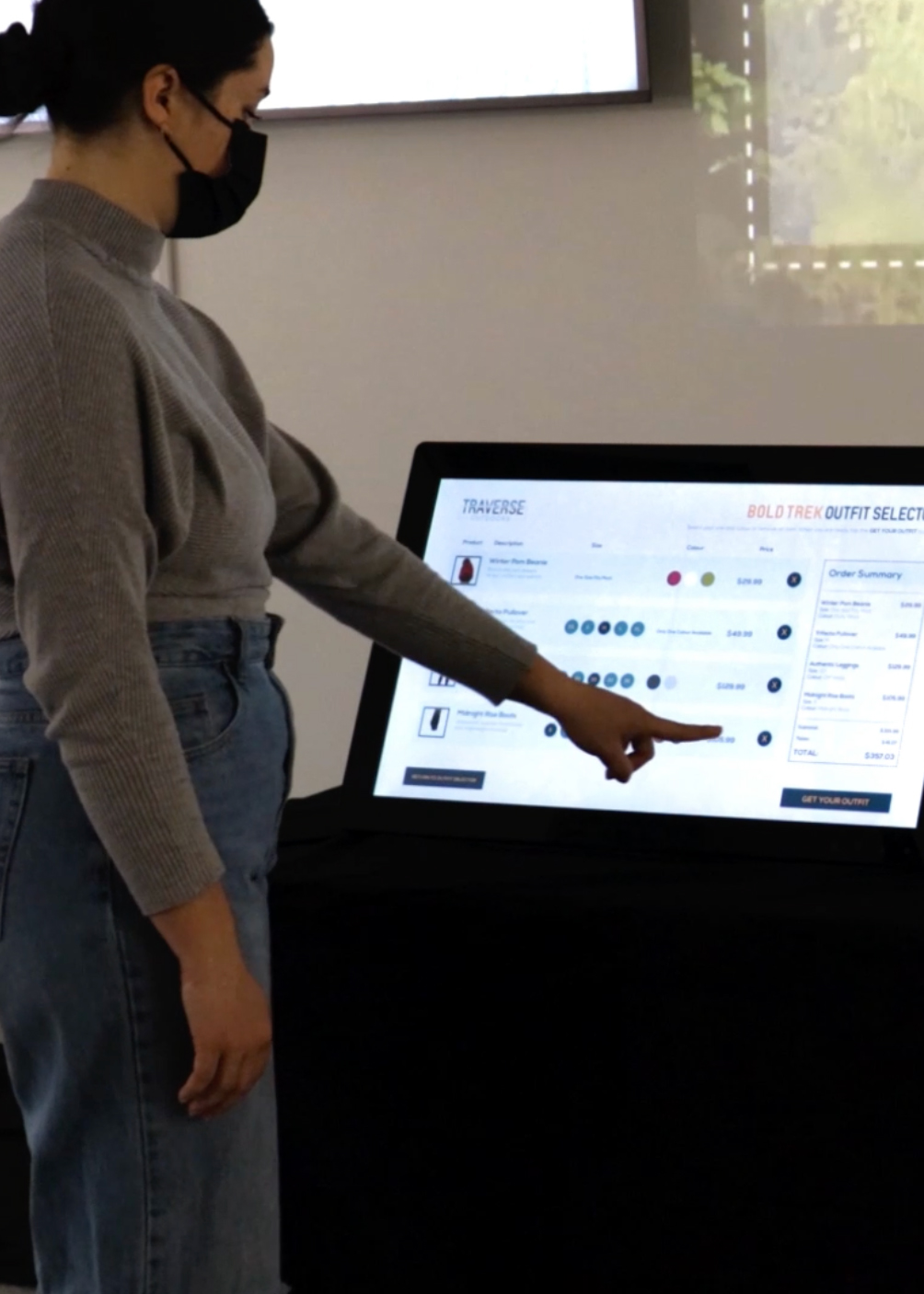 After the perfect outfit is created by the user, they can print out a receipt and bring it to the cashier to collect their outfit items. The ordering station saves time and effort when shopping, but also limits interactions and touch points, making it ideal for the world we have entered recently. The user should feel like they are trying the items on in a unique way. Ideally the user would see the promotional motion graphics videos first and want to experience more. They would then view/use the interactive catalogue and rotating product experience to learn more about the products that Traverse Outdoors has to offer. The touchscreen ordering kiosk would be used last to choose their outfit of choice so that they could bring the receipt to the cashier and leave happily with their products.The installation came together after the branding was created. I chose to name my brand Traverse Outdoors because I wanted it to relate to the subject at hand. Traverse means to travel across or through. Hiking often involves both of these actions which lead me to the logo design with a path-like design going across and through the word “Traverse”. Branding should have a meaning behind it that can be talked about rather than just making a logo to have a logo there. It is the main graphic that people will remember and that people will see and talk about. As for the rest of the branding, it was best to keep it simple and use the dotted lines (path) throughout the installation and emphasize the other elements using the main colour scheme. This keeps the design clean and simple for easy viewing.