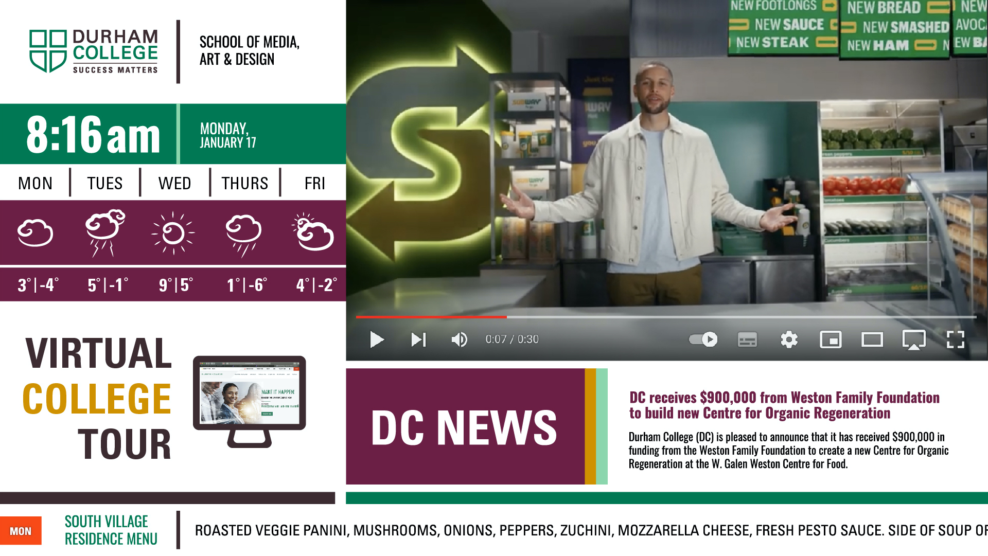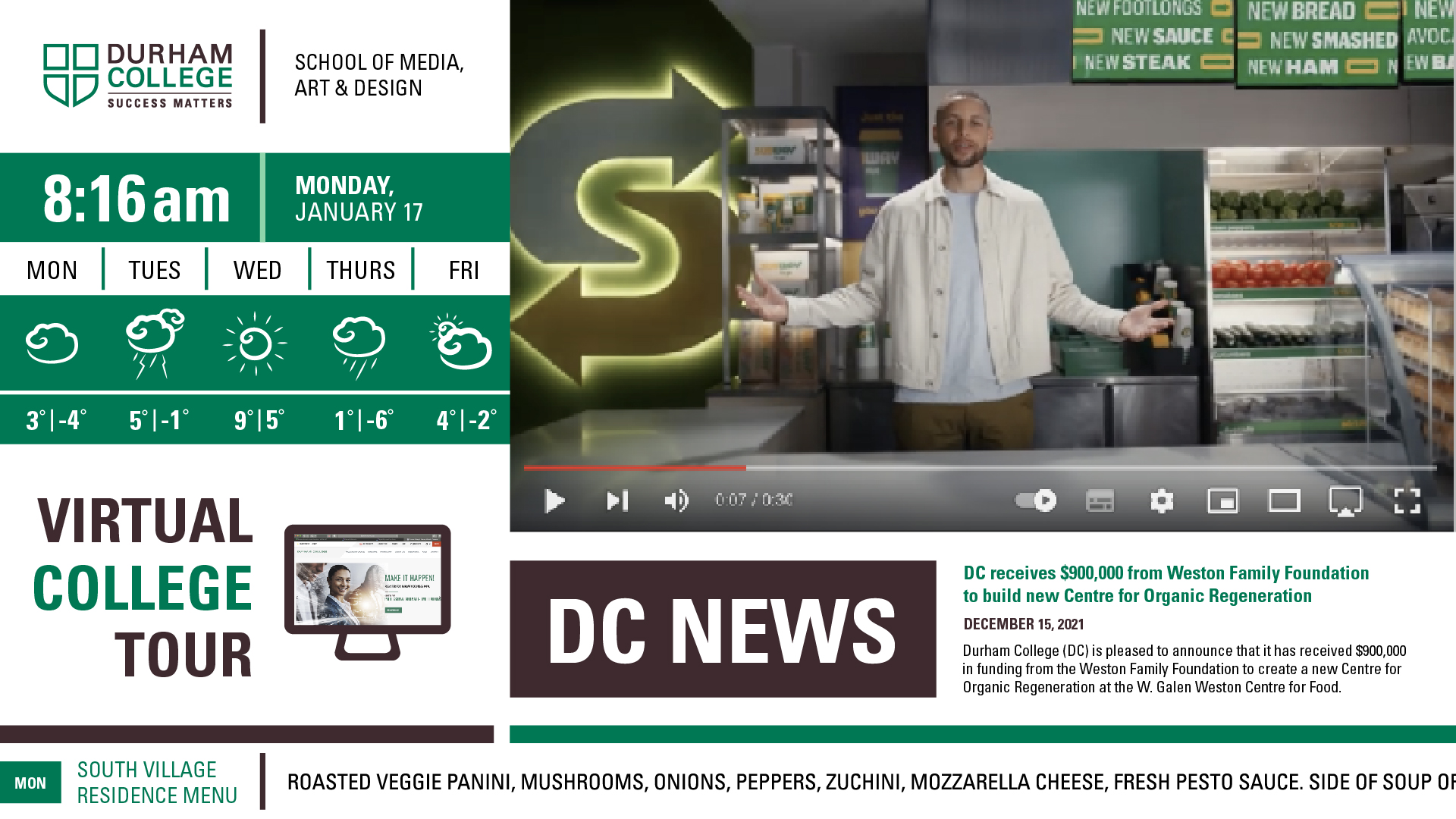 This digital signage was made for Durham College for one of their flat screen tv’s throughout the college itself. These digital signs are meant to have important information pertaining to the specific day, including: the time, date, weather, menu items, advertisements and more. This can be very helpful to people walking through the college and this type of signage is very popular in the world, so they are very relevant to all.